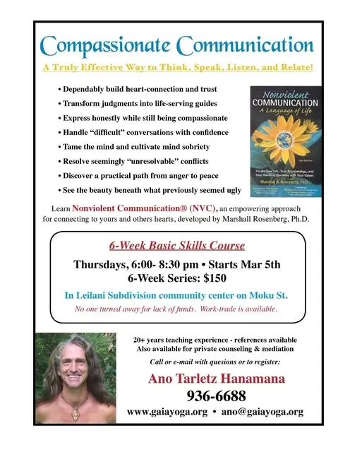 Starting on March 5 a 6-week basic skills course is offered for compassionate communication based on non-violent communication principles. The course focuses on building dependable heart-connection and trust, transforming judgments into life-serving guides, expressing honestly while still being compassionate, handling difficult conversations with confidence, resolving “unresolvable” conflicts and discovering a practical path from anger to peace. The course will be held on Thursday nights from 6 – 8:30 PM at the Leilani subdivision community center on Moku Street. There is a fee of $150. If you are interested, please contact Ano Tarletz Hanamana at (808) 936-6688 or ano@